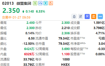 微盟集团( $02013.HK )涨超6%,截至发稿,涨6.33%,报2.35港元,成交额3.79亿港元。