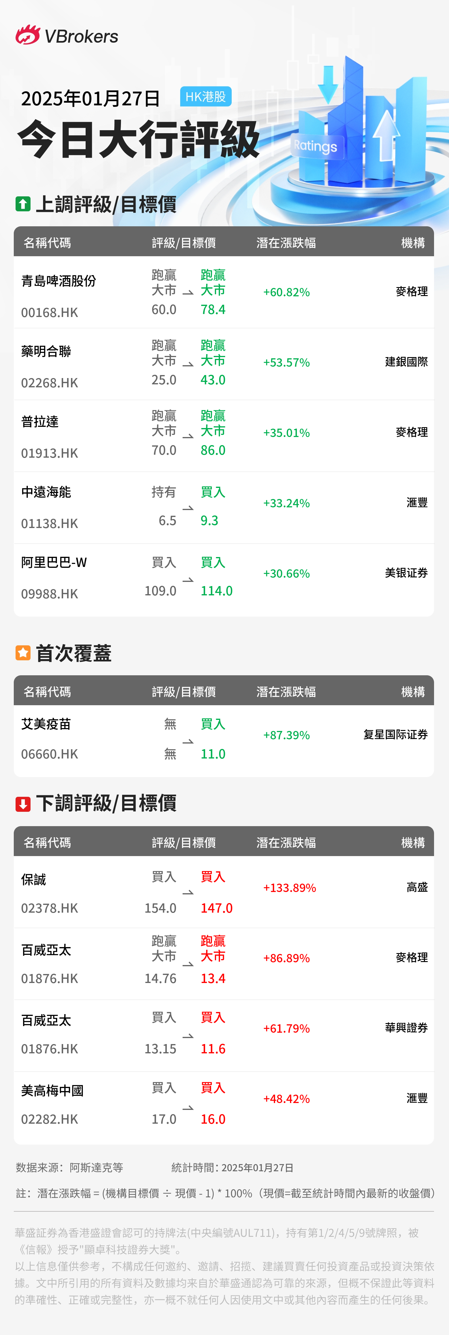 | 百威亚太 | 01876.HK | 下调 | $13.4 | $7.17 | 86.89% | 麥格理 |