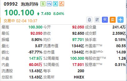 泡泡玛特涨超8%股价突破100港元,市值创阶段新高,海外扩张带动业绩高增长,中金称公司有望进入恒指成份股。