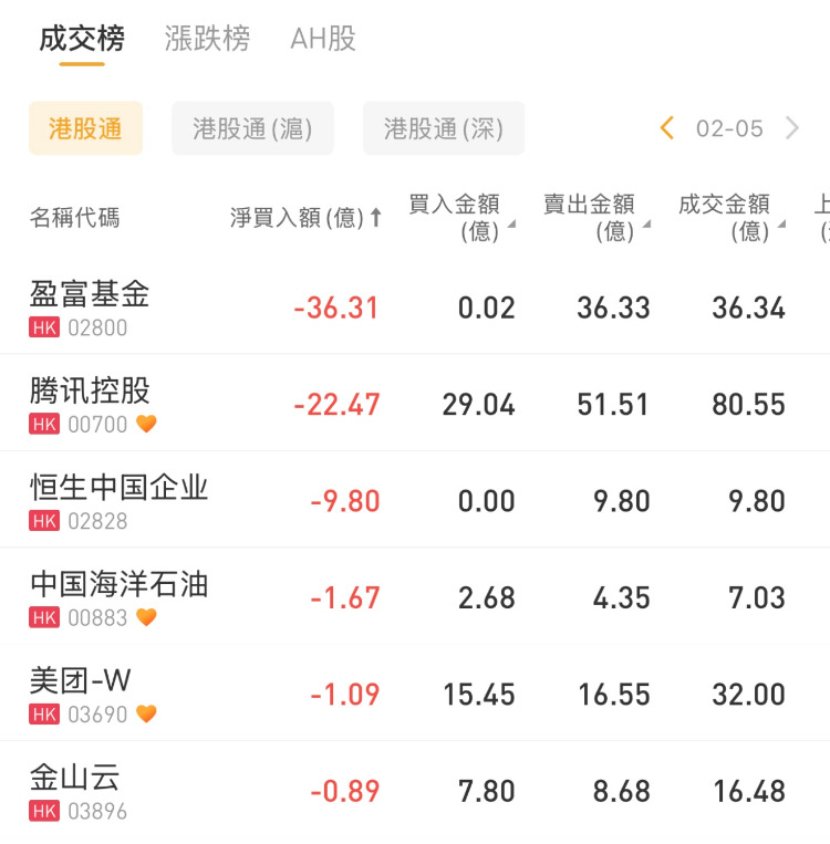 盈富基金、腾讯控股分别遭净卖出36.31亿港元、22.47亿港元。