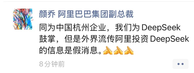 今日有传闻称,阿里计划以100亿美元的估值,投资10亿美元,认购DeepSeek股权。对此,阿里巴巴集团副总裁颜乔在朋友圈表示,同为中国杭州企业,阿里为DeepSeek鼓掌,但是外界流传阿里投资Deepseek的信息是假消息: