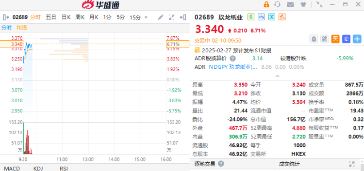 2月10日,玖龙纸业(02689)盈喜高开,截至发稿,涨6.71%,报3.34港元,成交额2866万港元。