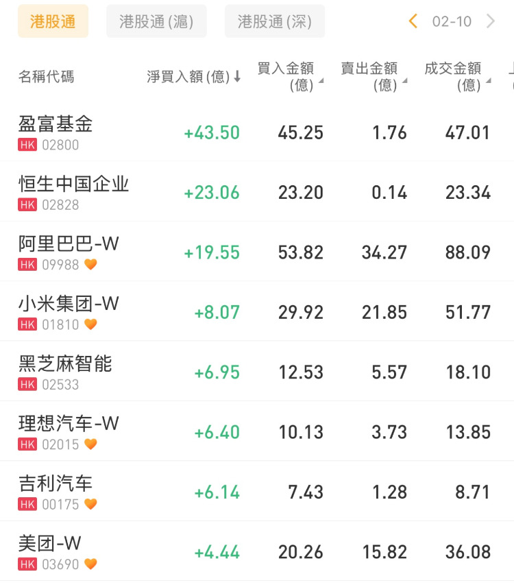 盈富基金、阿里巴巴-W、小米集团-W分别获南下资金净买入43.50亿港元、19.55亿港元、8.07亿港元。