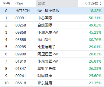 恒生科技成分方面,牛股频出,如 中芯国际 (00981.HK) 年内涨幅达50.31%, 金蝶国际 (00268.HK)年内涨49.82%, 小鹏汽车-W (09868.HK)涨45.23%。超大市值个股方面, 腾讯控股 (00700.HK) 年内涨4.8%,总市值已经超4万亿港元, 阿里巴巴-W (09988.HK) 年内涨28.03%,总市值超2万亿港元, 小米集团-W (01810.HK) 年内涨26.81%,连续创出历史新高,总市值也已经超过1万亿港元。