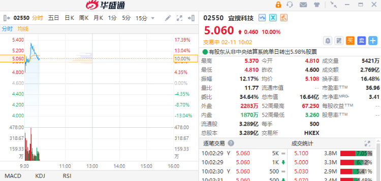 2月11日,宜搜科技(02550)一度放量涨超16%,截至发稿,涨10%,报5.06港元,成交额2.769亿港元,当前总市值不足17亿港元。