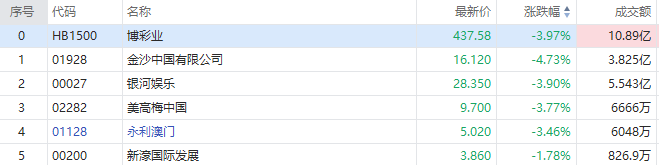 2月11日,博彩股普跌,截至发稿,金沙中国有限公司跌近5%,银河娱乐、美高梅中国、永利澳门跌超3%,新濠国际发展跌近2%。