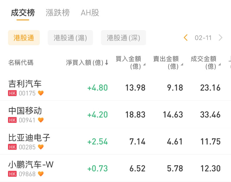 吉利汽车、中国移动、比亚迪电子分别获南下资金净买入4.80亿港元、4.20亿港元、2.54亿港元。