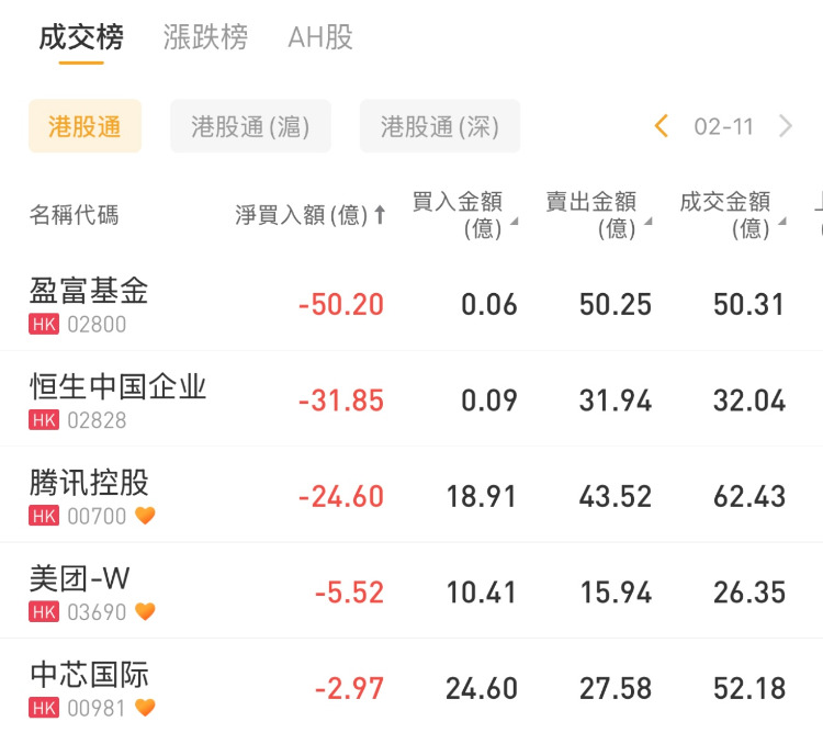 盈富基金、腾讯控股、美团-W分别遭沽出50.20亿港元、24.6亿港元、5.52亿港元。