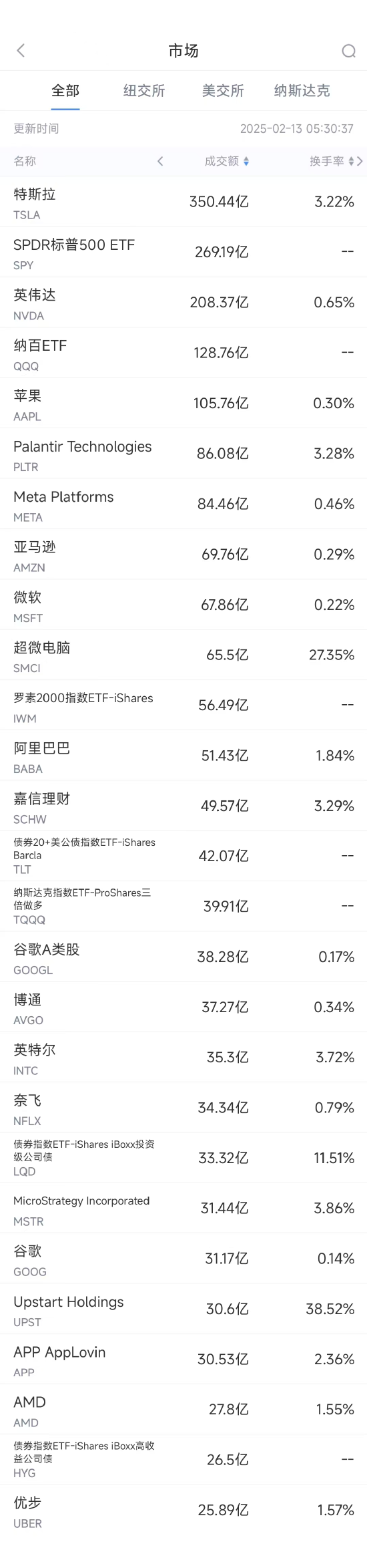 第4名Palantir收高4.24%,成交86.08亿美元。Wedbush证券公司认为,人工智能革命已经牢固地覆盖了软件领域,这一点从Palantir 和赛富时最近的业绩和公告中得到了证明。