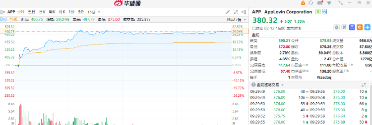 披露2024年四季度业绩后,美股AI应用股AppLovin(爱普拉维)的股价在盘后飙涨30%至492.02美元,隐隐有创新高之势,2024年年初至今该股涨超8.5倍,每股历史最高价为417.64美元。而美股AI硬件龙头股英伟达在同期的涨幅(165%)远低于这家软件公司。