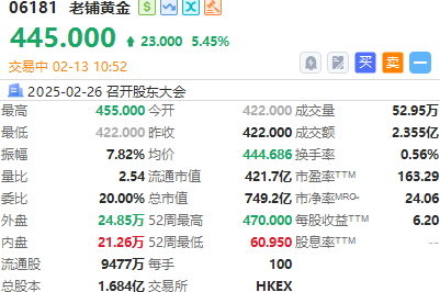 老铺黄金 $06181.HK 盘中涨超7%,年内股价已累涨超八成。截至发稿,股价上涨5.45%,现报445港元,成交额2.35亿港元。