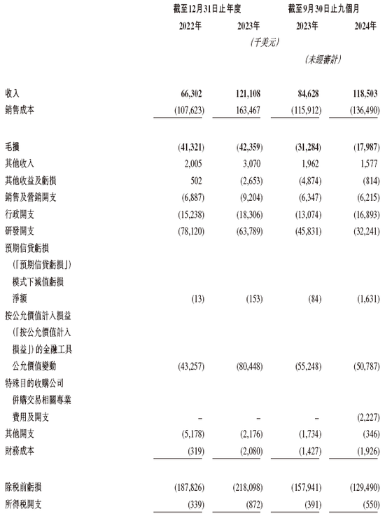 财务数据显示,在过去的2022年、2023年和2024年前九个月,图达通的营业收入分别为0.66亿、1.21亿和1.19亿美元,相应的净亏损分别为1.88亿、2.19亿和1.30亿美元,相应的经调整净亏损分别为1.43亿、1.37亿和0.76亿美元。