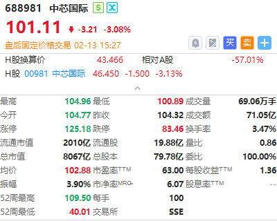 中芯国际( $00981.HK )午后急跌逾3%,报101.11港元,成交额71亿港元。
