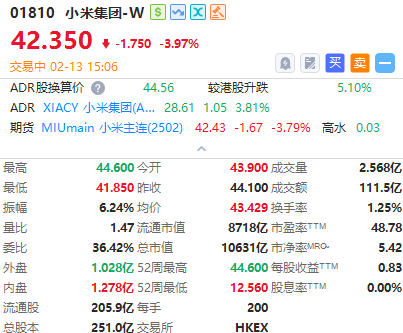 2月13日消息,港股小米集团 $01810.HK 跳水跌4%,报42.35港元,成交额超百亿港元,总市值1.06万亿港元,年初至今,小米涨幅超20%。