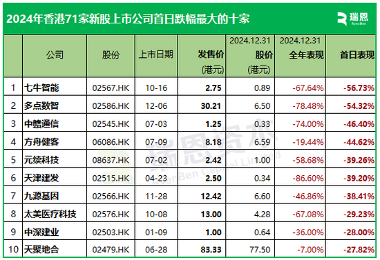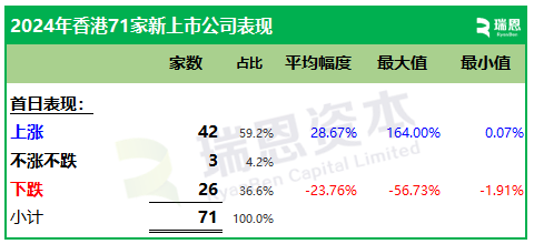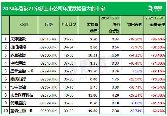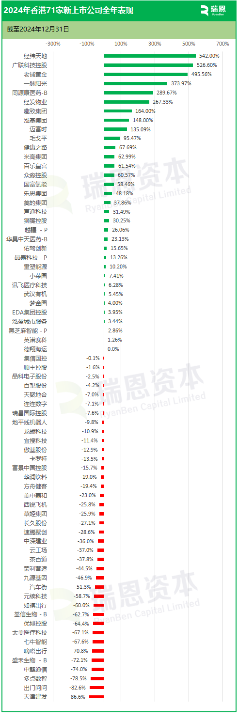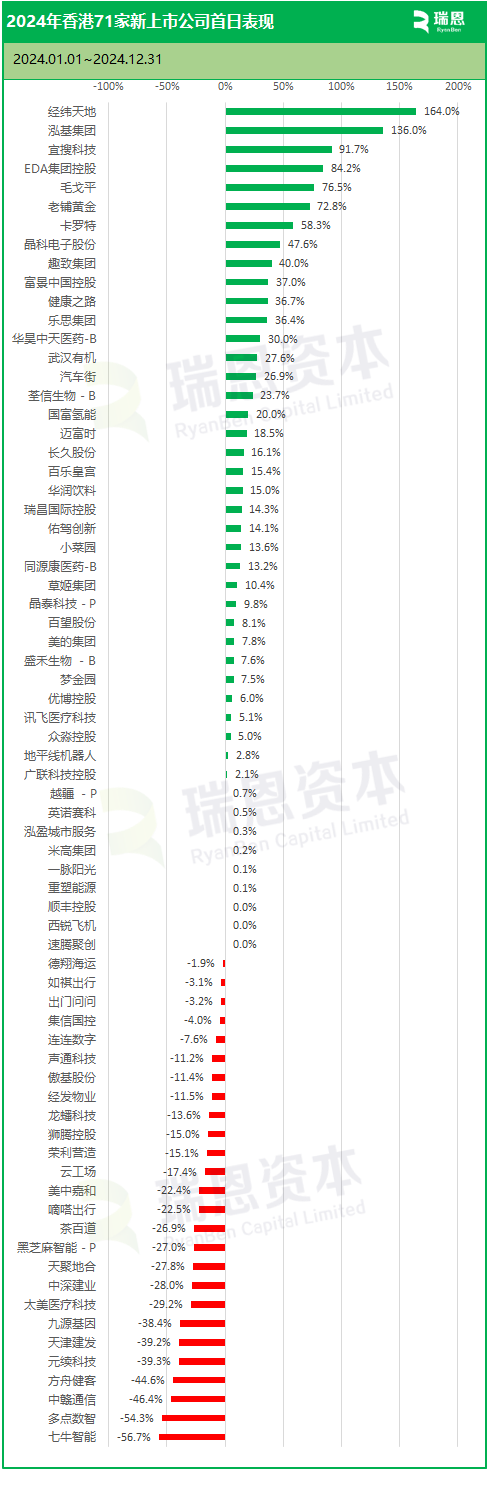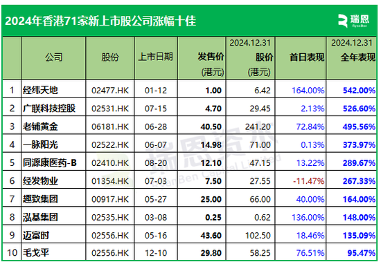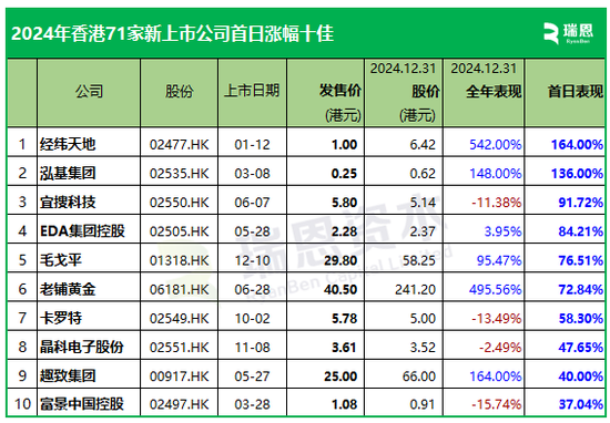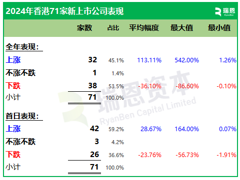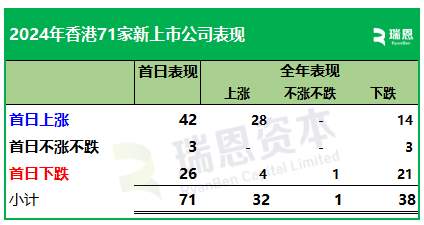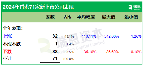 * 全年表现,是按2024年12月31日的收市价跟IPO发行价比较;首日表现是IPO首日的收市价跟IPO发行价(如果不是IPO,则以首日上市的开盘价为基础)比较