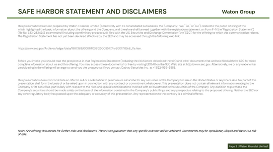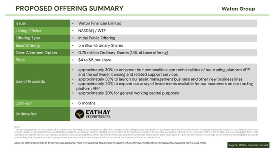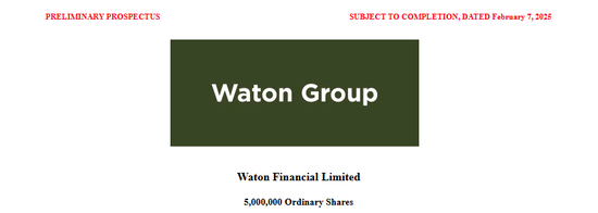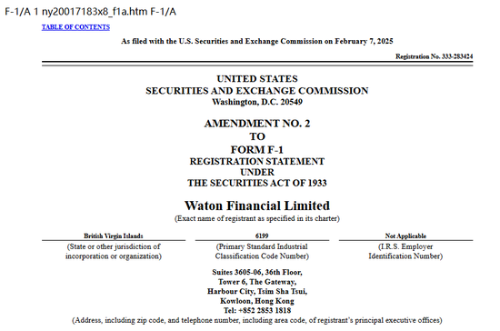 2025年2月7日,来自香港的Waton Financial Limited(以下简称“华通证券国际”)在美国证券交易委员会(SEC)更新招股书,拟在美国纳斯达克IPO上市,股票代码为WTF。其于2023年12月22日在SEC秘密递表,后于2024年11月22日公开披露招股书。