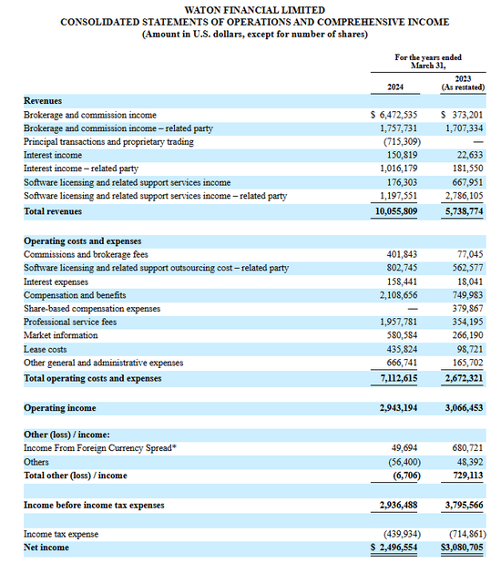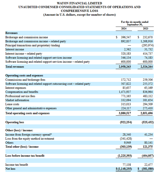 招股书显示,在过去的2023财年、2024财年(财政年度结算日期为每年3月31日)和2025财年前六个月(截至2024年9月30日),华通证券国际的收入分别为573.88万、1,005.58万和295.83万美元,相应的净利润分别为308.07万、249.66万和-114.83万美元。