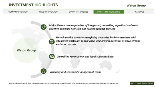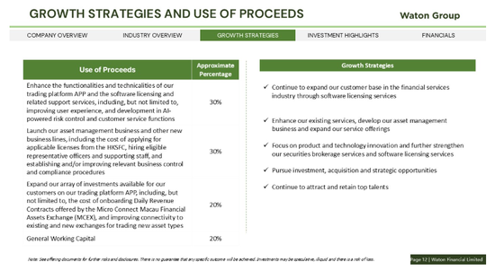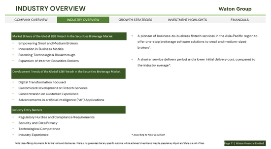 华通证券国际,主要从事提供(i)香港证券交易所上市证券的证券经纪服务,包括沪港通和深港通、纽约证券交易所、纳斯达克股票市场下的股票,通过华通证券的电子交易平台向其企业和个人经纪客户提供保证金融资服务和其他辅助服务以及债券分销服务;以及(ii)软件许可和相关支持服务,包括向金融机构提供交易平台APP许可、升级和增强、维护和其他相关服务。自2023年9月起,华通证券国际提供软件许可和相关支持服务,以专注于运营和服务领域的专业知识。WSI已开发并提供Broker Cloud解决方案给证券经纪商,结合软件授权及相关支持服务、证券经纪服务、保证金融资服务及其他相关服务,为证券经纪商客户提供永久本地授权交易平台APP及可选的相关支持服务,具备前、中、后台操作功能及证券交易功能,证券交易订单可通过WSI进行清算及交收。
