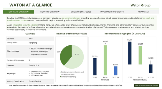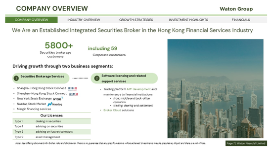 华通证券国际,来自香港,作为一家控股公司,主要通过香港子公司华通证券国际有限公司(WSI)、华通科技国际有限公司(WTI)提供证券经纪和金融科技服务。