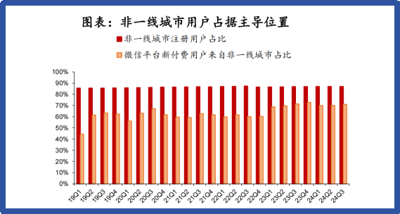 从特点上来看,同程的优势在于大众市场端的错位竞争优势上。公司通过All in小程序战略聚焦大众市场,尤其是“小镇青年”的出行需求,与携程形成对位优势。截至2024年中期,同程旅行的注册用户中87%来自非一线城市,微信平台新付费用户中约70%来自非一线城市。其在大众市场拥有显著的用户基础和渗透率,这一优势在消费放缓的行业背景下尤为突出。