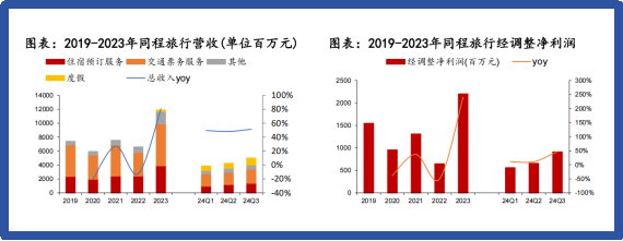 值得关注的是,同程旅行近年对海外市场的布局取得了显著的增长成效。公司于2023年9月启动“目的地全球计划”,与新加坡、韩国等多个国家和地区政府合作,上线针对非一线城市居民的出海旅游产品。根据公司2024年3季度业绩会数据,公司24Q3国际机票票量同比增长超过 110%,国际酒店间夜量同比增长超过 130%。