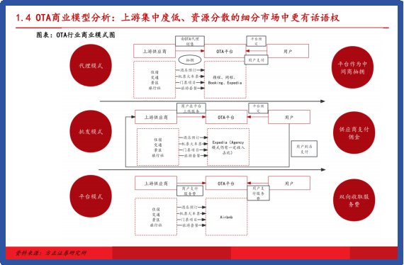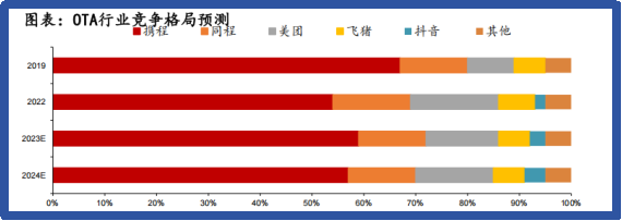 随着国内旅游业景气的复苏,以及抖音、快手、小红书等内容平台纷纷入局旅游行业,传统OTA平台的竞争格局或迎来变数,但短期来说,内容平台难以颠覆OTA平台打造的供应链壁垒,OTA仍将是旅游预订的主要渠道。且在宏观经济增长较弱的背景下,OTA企业之间也更多是以互相扶持,互相成就的方式在发展。