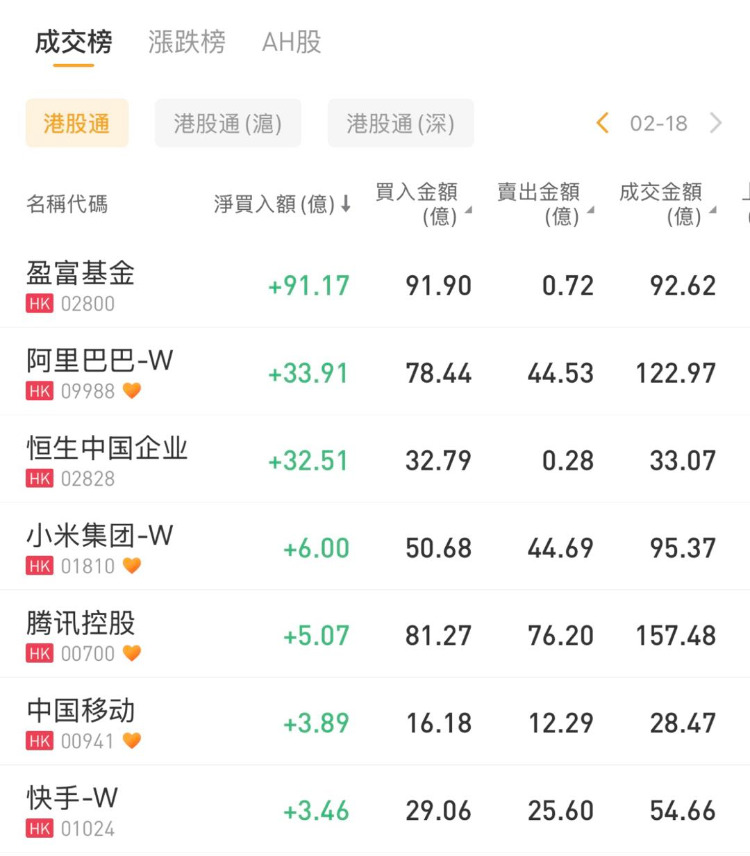 盈富基金、阿里巴巴-W、小米集团-W分别获南下资金净买入91.17亿港元、33.91亿港元、6亿港元。