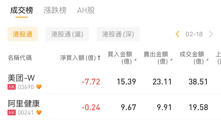 美团-W、阿里健康分别遭沽出7.72亿港元、0.24亿港元。