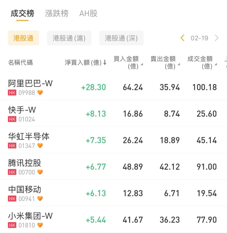 阿里巴巴-W、快手-W、华虹半导体分别获南下资金净买入28.3亿港元、8.13亿港元、7.35亿港元。