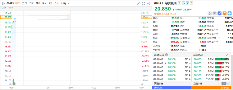 敏实集团 $00425.HK 高开近15%,截至发稿,涨28%,报20.85港元,成交额3.84亿港元。