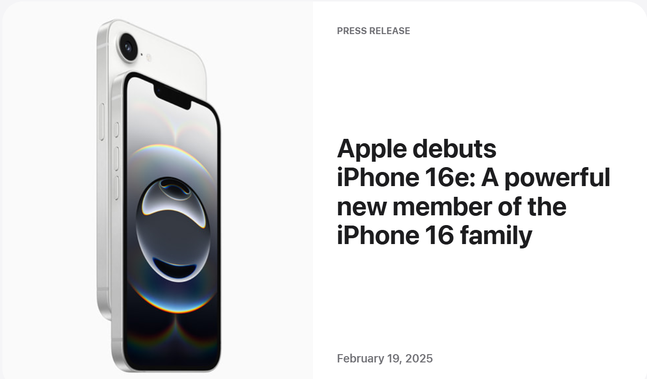 北京时间2月20日凌晨,苹果在官网上正式发布了iPhone16系列的新成员,命名为“iPhone 16e”,售价4499元起。