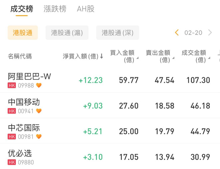 阿里巴巴-W、中国移动、中芯国际分别获南下资金净买入12.23亿港元、9.03亿港元、5.21亿港元。