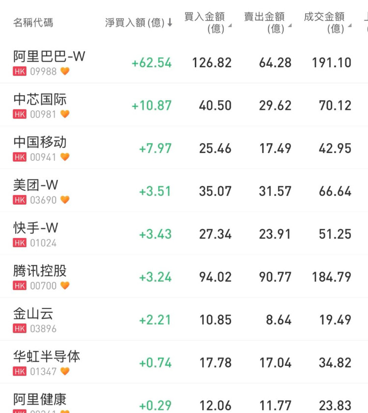 阿里巴巴-W、中芯国际、中国移动分别获南下资金净买入62.54亿港元、10.87亿港元、7.97亿港元。
