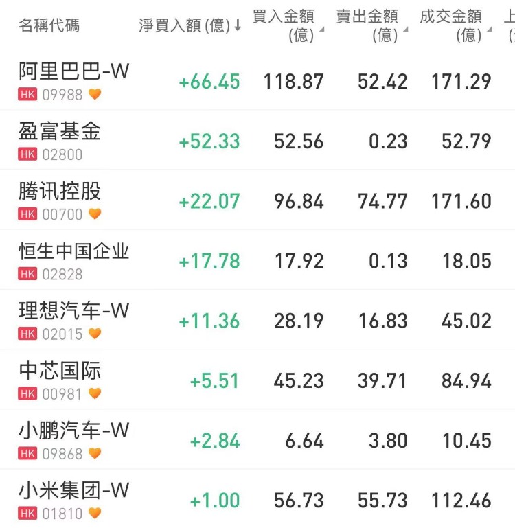 阿里巴巴-W、盈富基金、腾讯控股分别获南下资金净买入66.45亿港元、52.33亿港元、22.07亿港元。