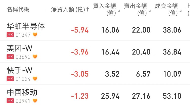 华虹半导体、美团-W、快手-W分别遭沽出5.94亿港元、3.96亿港元、3.05亿港元。