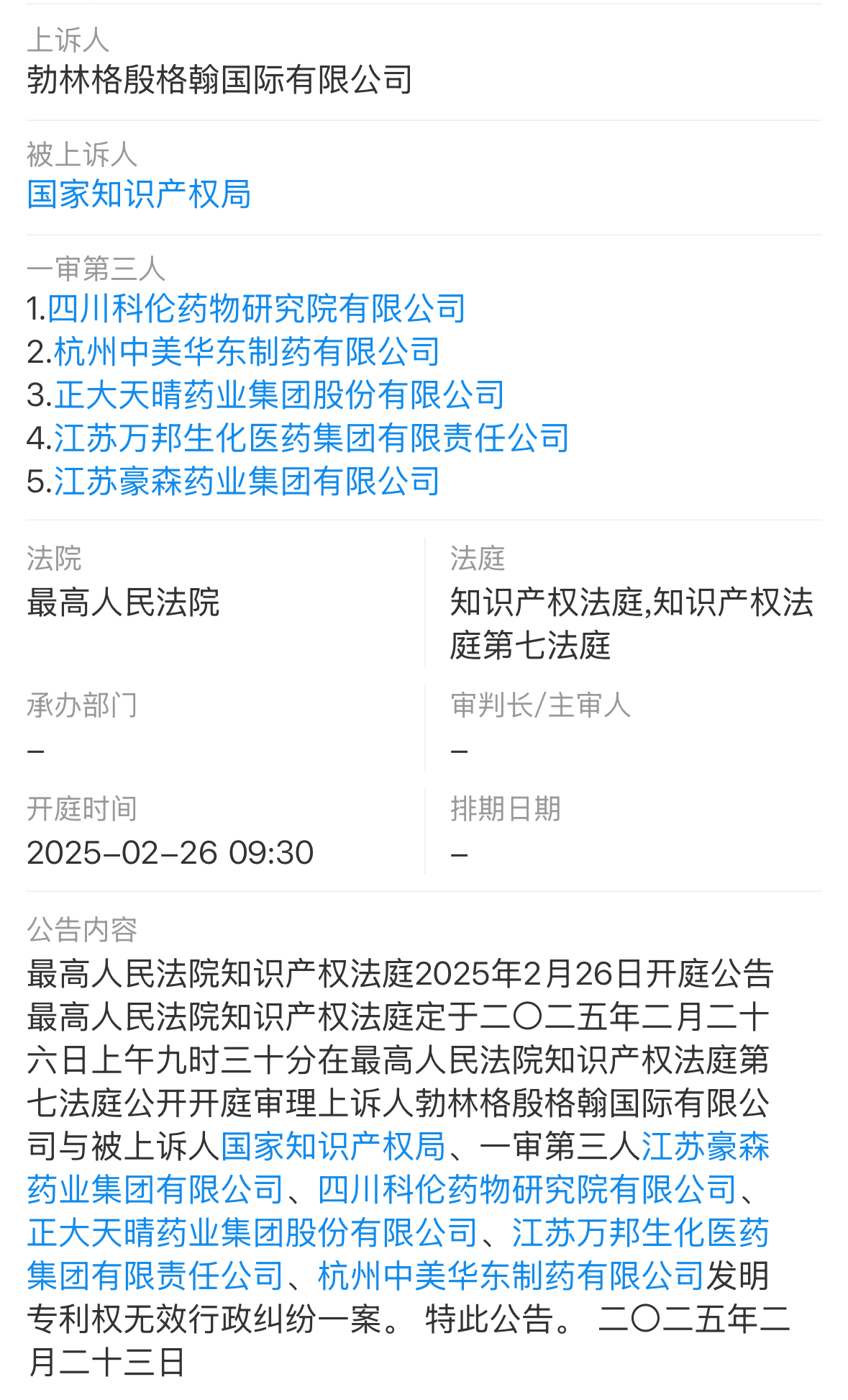 2月25日,企查查App显示,最高人民法院知识产权法庭定于2025年2月26日上午9时30分在最高人民法院知识产权法庭第七法庭公开开庭审理上诉人勃林格殷格翰国际有限公司(下称“勃林格殷格翰”,BI)与被上诉人国家知识产权局、一审第三人江苏豪森药业集团有限公司(下称“江苏豪森”)、四川科伦药物研究院有限公司(下称“四川科伦”)、正大天晴药业集团股份有限公司(下称“正大天晴”)、江苏万邦生化医药集团有限责任公司(下称“江苏万邦”)、杭州中美华东制药有限公司(下称“中美华东”)发明专利权无效行政纠纷一案。