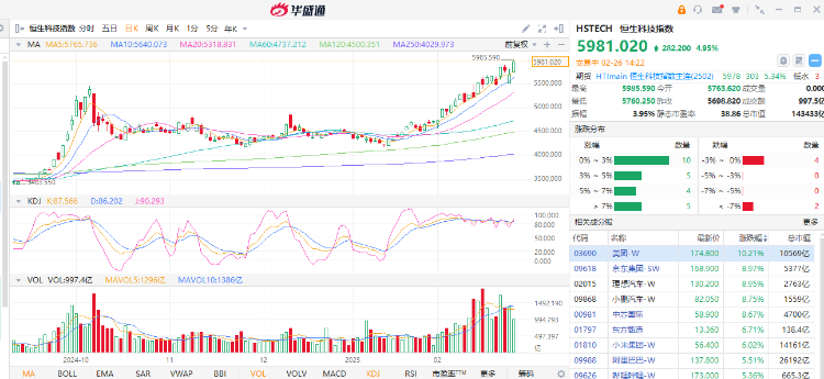 今天早盘,港股持续拉升,恒生科技指数涨超4%,创2021年12月以来新高。美团-W涨超10%,中芯国际、小鹏汽车-W涨超8%、阿里巴巴-W涨超5%。港股的强势亦带动了A股,北证50指数涨近2.5%,机器人概念股持续走强,中大力德、兆威机电、宝通科技、上海机电、五洲新春等十余股涨停。