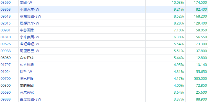 中芯国际涨超7%,小米集团-W涨超6%均创历史新高。美团-W、阿里巴巴-W、腾讯控股、百度等巨头也纷纷走高。