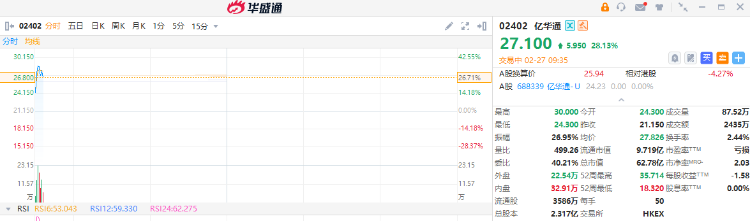 亿华通(2402.HK)跳空高开近15%后进一步走强,盘初一度涨41.84%报30港元,股价创2024年10月8日以来新高。亿华通A股停牌。