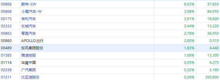 受多重利好提振,港股汽车股多数走强。截至发稿,蔚来-SW(09866.HK)、小鹏汽车-W(09868.HK)、吉利汽车(00175.HK)分别上涨8.92%、3.98%、3.91%。