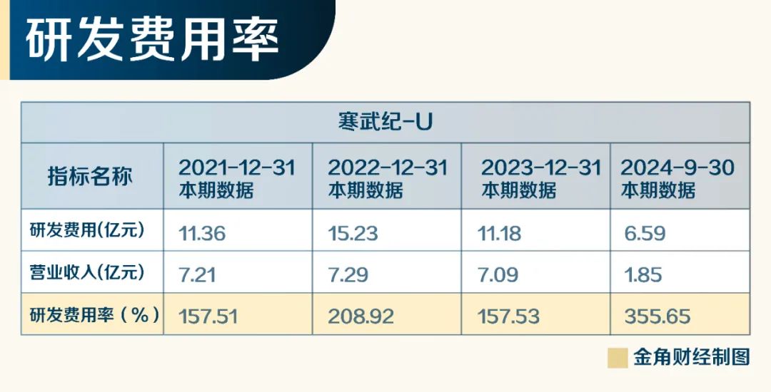 2021-2023年,寒武纪的研发费用分别为11.36亿元、15.23亿元、11.18亿元,均远高于同期的营收,后者同期分别为7.21亿元、7.29亿元、7.09亿元。计算下来,这几年寒武纪的研发费用率均超过150%,2022年甚至超过200%。
