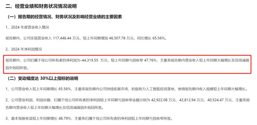 根据寒武纪发布了2024年业绩快报,去年营收同比增长65.56%至11.74亿元,归母净利润则为-4.43亿元。