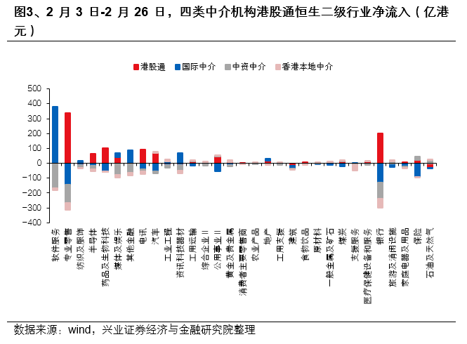 根据港股托管机构拆分来看,南下资金或是本轮做多港股的主力资金之一。1月14日至2月26日,港股通累计净流入1672.1亿港元,而同期国际中介、中资中介和香港本地中介分别减仓787.0亿港元、554.6亿港元、97.7亿港元。