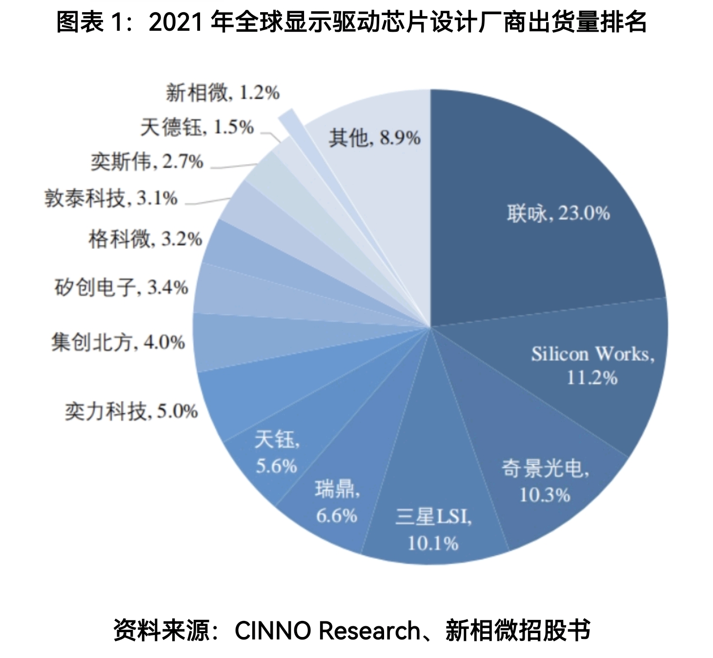 招股书还显示,2021年,在中国内地显示驱动厂商中,天德钰与新相微的市占率分别为1.5%、1.2%,较为接近。