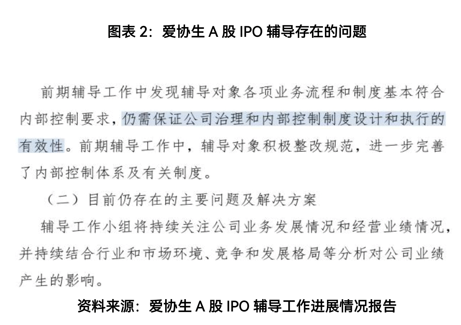 时代商业研究院发现,在2024年7月发布的爱协生A股IPO辅导工作进展情况报告中,中信建投指出,前期辅导工作中,发现爱协生各项业务流程和制度基本符合内部控制要求,仍需保证公司治理和内部控制制度设计和执行的有效性。