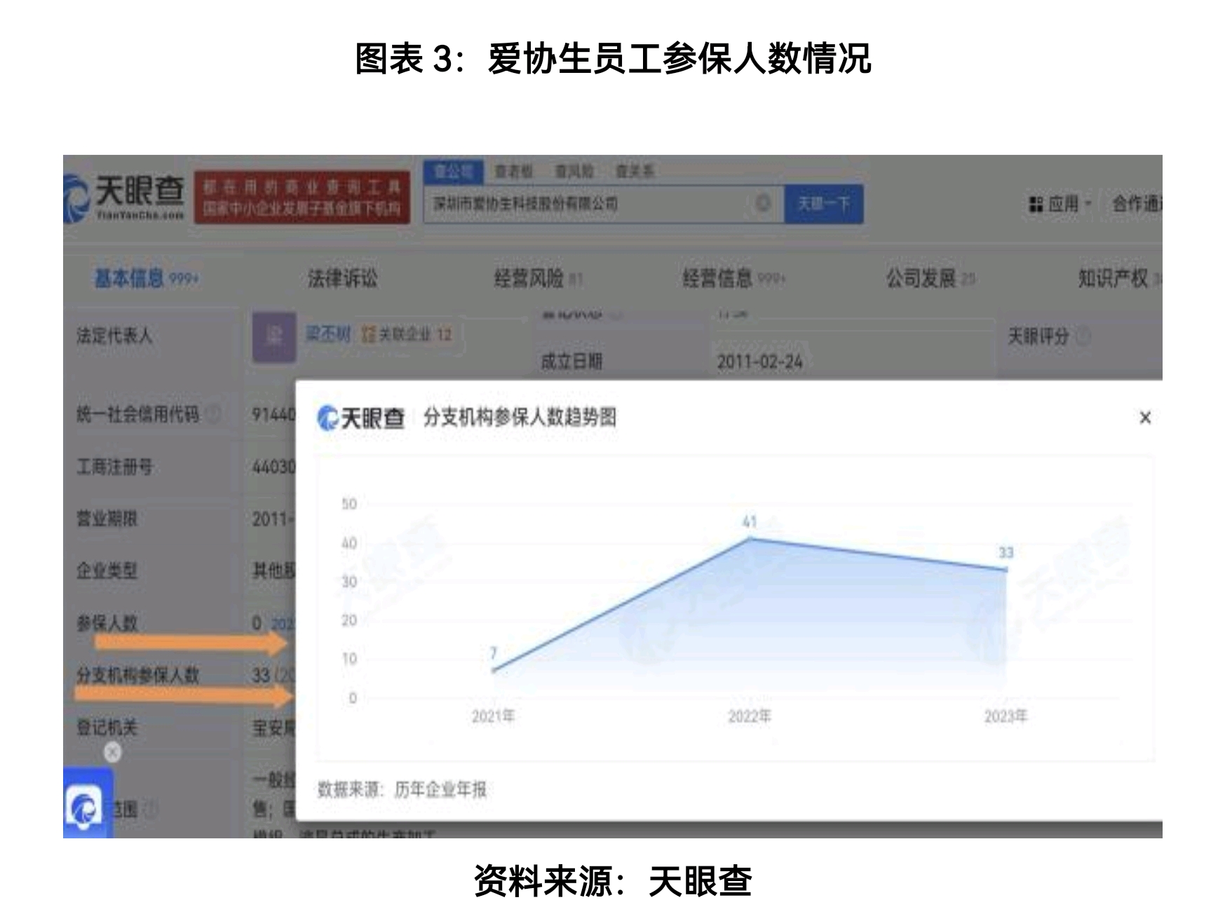 时代商业研究院发现,爱协生官网信息显示,该公司现共有员工300余人,2022年营业额突破8亿元。而新相微2024年营收预计为5.07亿元,低于爱协生。不过,天眼查显示,爱协生2023年的参保人数为0人,分支机构的参保人数仅为33人,较2022年减少8人。