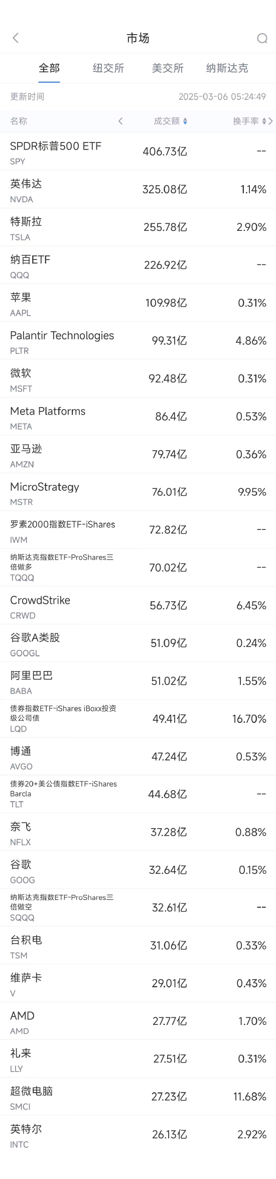 第4名Palantir收高6.79%,成交99.31亿美元。券商Wedbush称Palantir有望获得更多美国政府订单,维持“跑赢大盘”评级。