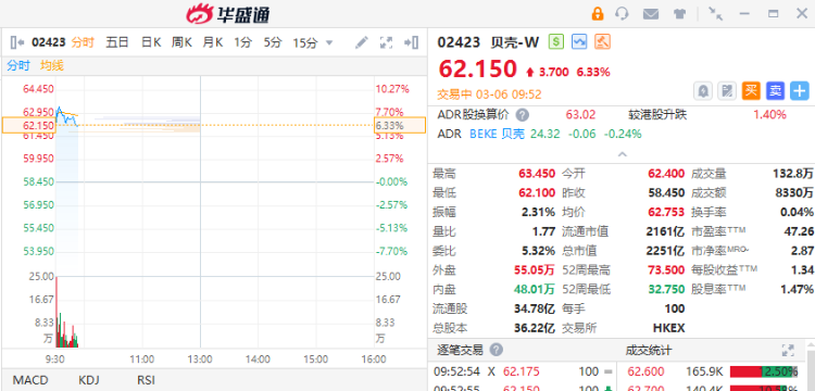 3月6日,贝壳-W(02423)早盘一度涨超8%,截至发稿,涨6.33%,报62.15港元,成交额8330万港元。