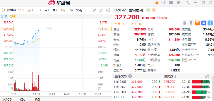蜜雪集团(02097)盘中涨超10%,高见327.2港元,创上市新高。港股茶饮股集体走强,截至发稿,奈雪的茶涨超14%,茶百道涨超6%,古茗涨超2%。