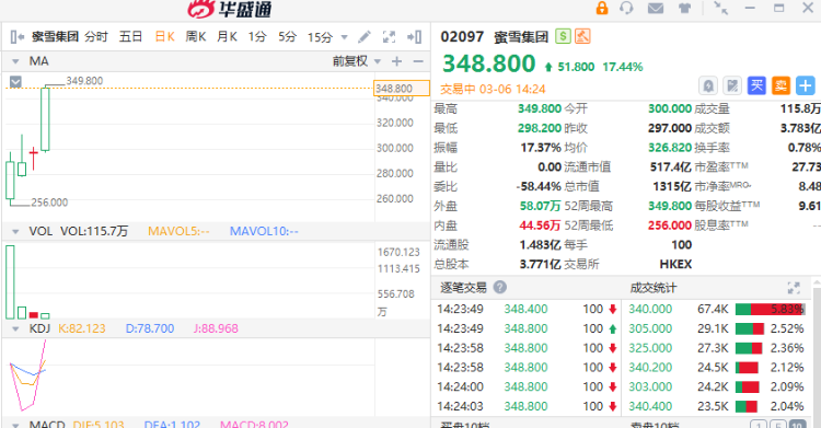 3月6日,蜜雪集团(2097.HK)股价延续了上市以来的上涨势头。